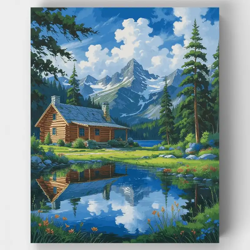 Profesional Cabaña de Troncos Alpina Reflejo de Montaña – Kit de pintar por números – Lienzo Enrollado / 24 Colores