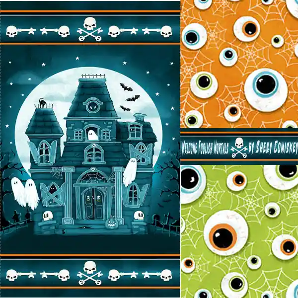 Colección Welcome Foolish Mortals diseñada por Shelly Comiskey para Henry Glass, es una terrorífica colección de telas de Halloween. Al entrar en una mansión una voz que dice:”¡Bienvenidos mortales!” Preguntándote de donde viene la voz, levantas la vista y ves un fantasma pálido mirándote. Mientras castañean los dientes por el susto, ves un esqueleto cruzar el pasillo. Los fantasmas se agolpan a tu alrededor cuando se cierra la puerta de la mansión. La oscuridad te hace caminar en círculos entre telarañas pegajosas. Welcome Foolish Mortals invita a todo tipo de criaturas espeluznantes a salir de las sombras, incluidas arañas, esqueletos, fantasmas y más. Tus huesos se congelaran mientras creas una colcha inquietante con estas telas que presentan elementos que brillan en la oscuridad.
