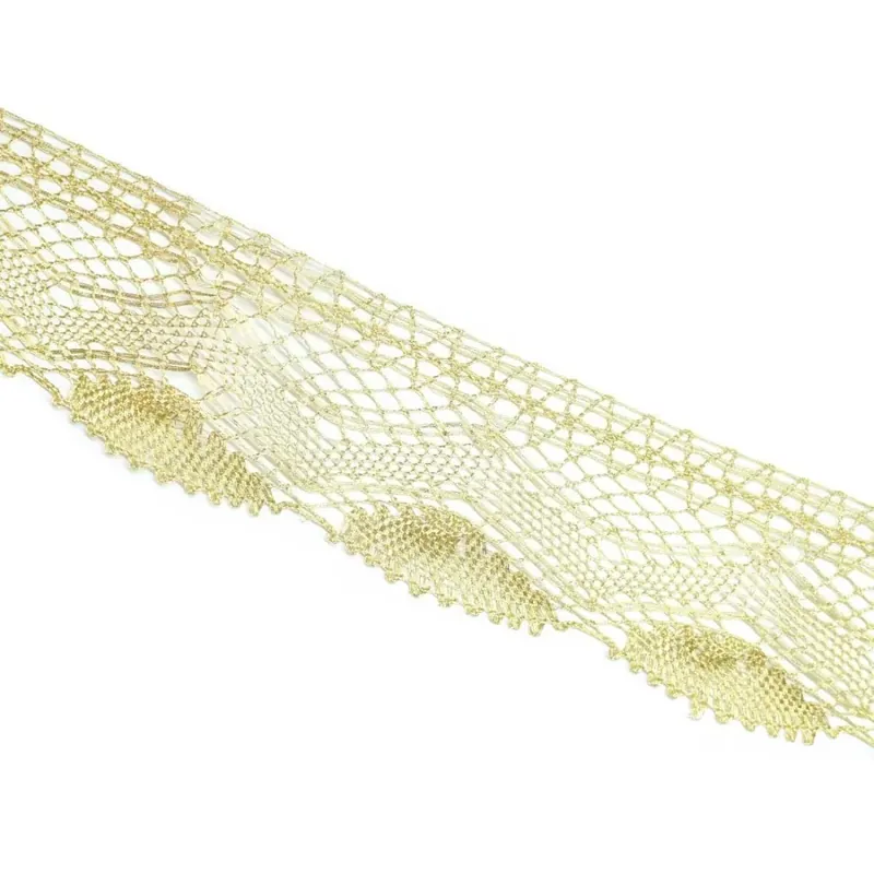 Puntilla dorada perfecta para todo tipo de decoraciones. Ideal para utilizar en adornos religiosos y en época de Semana Santa. Mide 5.5cm de ancho total. Con este encaje metalizado podrás dar un estilo renovado y diferente a cualquier tela. Se cose fácilmente a cualquier tipo de tejido. Su brillo le da un toque más elegante y sofisticado. Esta puntilla dorada es estupenda para coser en mantelería, cortinas, colchas y otros complementos del hogar. Composición: 100% Poliéster. Precio por metro.