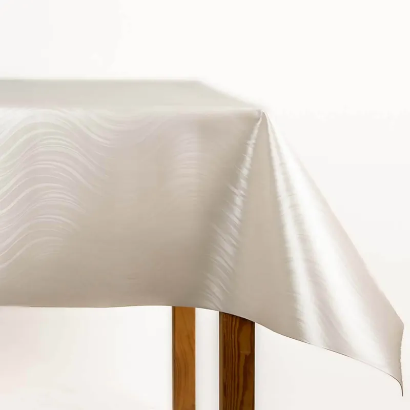 Tela de Hule con efecto ondas de ligero brillo sobre un tono crudo suave, diseño elegante y muy práctico.