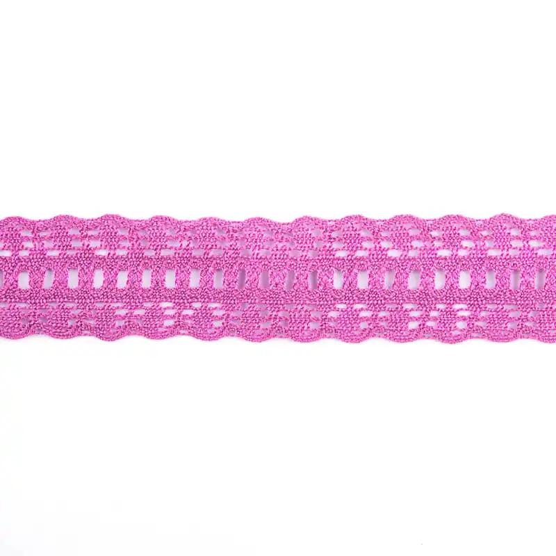 Puntilla ancha de 4,3 cm. en color rosa fucsia. Ideal para decorar tus creaciones, precio en oferta por metro, compra lo que necesites.