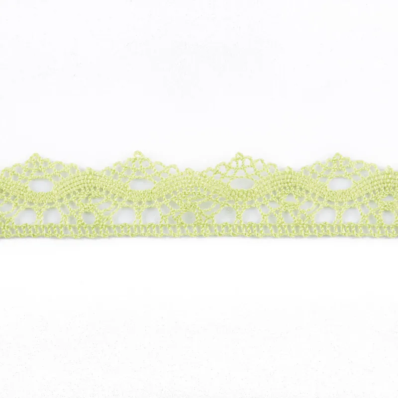 Tira de puntilla en color verde pistacho. Tira de puntilla calada en forma de ondas de 3 cm de base de ancho en su zona más ancha y 2,3 cm en la menos ancha, toda del mismo color. Compra a partir de 1 metro, compra los metros de puntilla que necesites. Precio en oferta hasta agotar existencias.