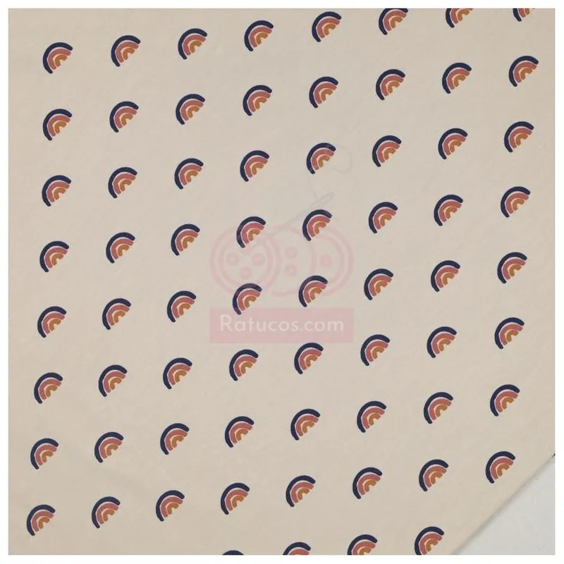 Tela de punto de camiseta con estampado de arcoíris en fondo lino.