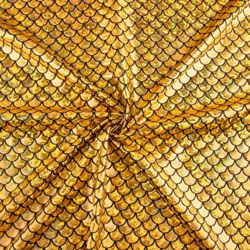 Esta tela simula escamas brillantes en color dorado con efecto tornasolado sobre fondo negro, generando destellos que cambian según la luz y el movimiento, ideal para diseños llamativos y escénicos.