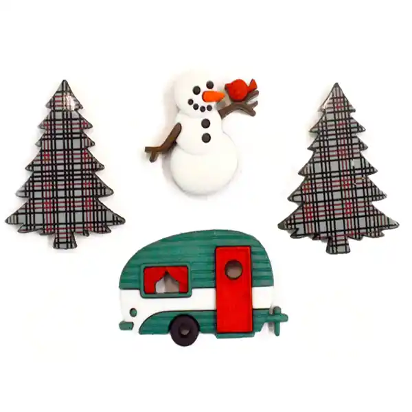 Botones Merry Campers – Dress It Up. Este paquete de Botones de acampada navideña pertenece a la marca Dress It Up, una famosa empresa de Estados Unidos que se dedica a la fabricación de botones decorativos que cuentan con una gran calidad y un diseño muy original.