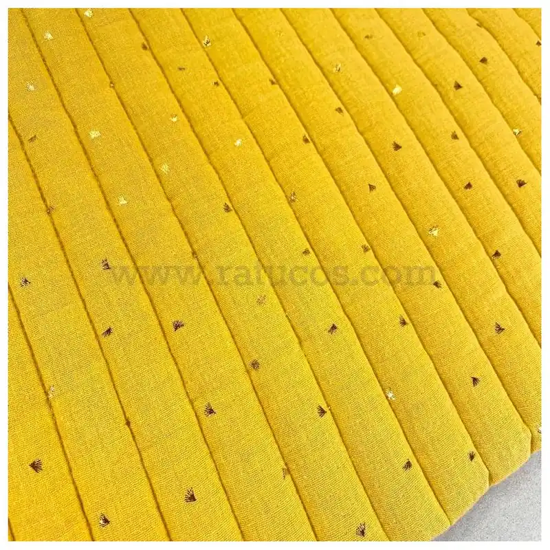 Tela de doble gasa acolchada mostaza, con aplicación foil dorada.
