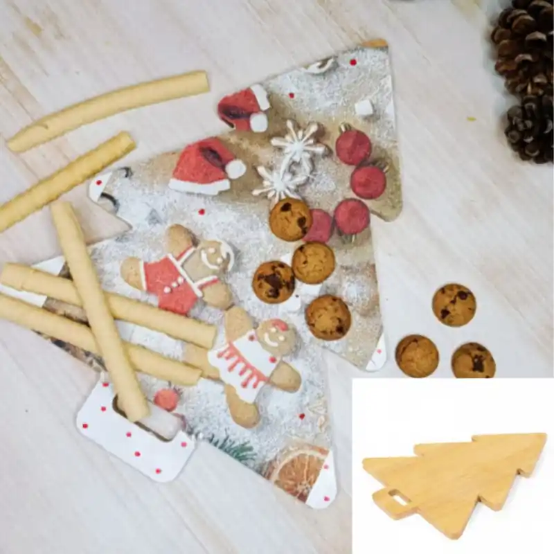 Tabla de cocina con original diseño en forma de árbol de navidad, fabricada en suave bambú y con asa troquelada para un firme manejo, muy fácil de limpiar y guardar.