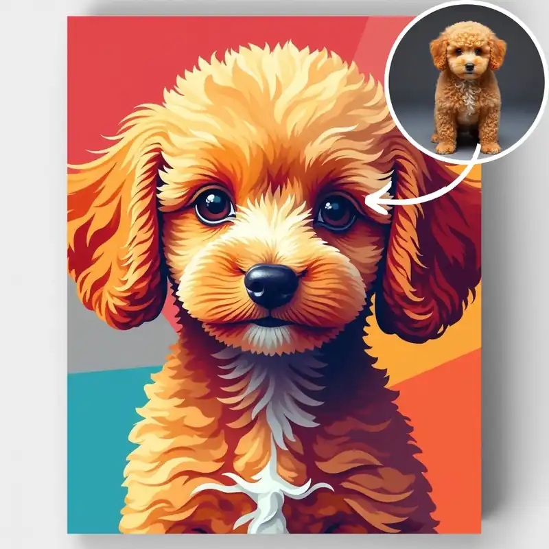 Transforma este adorable retrato de cachorro en tu propia obra maestra con nuestro kit de Pintar por Números de estilo Pop Art moderno. Este diseño vibrante presenta un encantador Caniche Toy en tonos dorados cálidos sobre un llamativo fondo geométrico de turquesa, coral y naranja. El estilo artístico combina elementos contemporáneos del pop art con texturas detalladas del pelaje, creando una pieza única y llamativa que captura la dulce expresión y personalidad de este esponjoso compañero. ¿A quién le encantará? Este kit es perfecto para amantes de las mascotas, entusiastas del arte moderno y cualquier persona que busque añadir un toque contemporáneo a la decoración de su hogar. Ya seas un principiante en busca de una divertida salida creativa o un pintor experimentado que desea probar algo fresco y moderno, este kit de Pintar por Números ofrece el equilibrio perfecto entre desafío y disfrute. También es un excelente regalo para dueños de perros que aprecian el arte único. ¡Comienza a pintar hoy y crea una pieza impactante que celebra el encanto de nuestros amigos de cuatro patas de una manera moderna y artística!