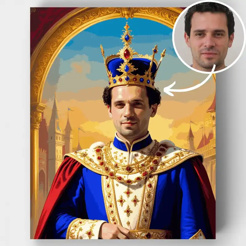 Transforma tu foto querida en una majestuosa obra maestra medieval con este Kit de pintar por números personalizado. Tu imagen subida será reimaginada en un estilo real, con atuendos reales ornamentados que incluyen una corona incrustada de joyas, lujosas túnicas azules y rojas adornadas con embellecimientos dorados, y un impresionante fondo de castillo enmarcado por un elegante arco dorado. La rica paleta de colores de azules reales, rojos profundos y dorados brillantes crea un retrato verdaderamente noble digno de colgar en cualquier galería de castillo. ¿A quién le encantará? Este kit de transformación real es perfecto para entusiastas de la historia, amantes del arte fantástico y cualquiera que sueñe con verse retratado en esplendor medieval. Ya seas un pintor principiante buscando un proyecto creativo único o estés buscando un regalo distintivo que hará que alguien se sienta como verdadera realeza, este Kit de pintar por números personalizado ofrece tanto una experiencia artística atractiva como una pieza de arte de pared personalizada que iniciará conversaciones. ¡Comienza tu viaje para crear tu propio retrato real hoy!