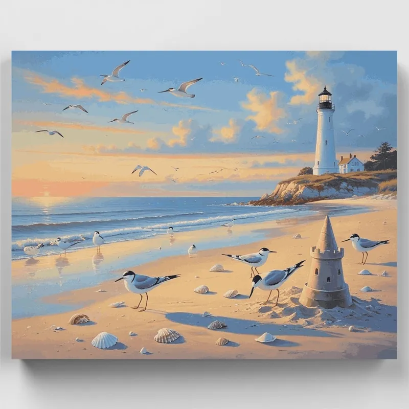 Transforma tu espacio creativo con este encantador Kit de pintar por números que presenta una serena escena costera con faro. Esta hermosa obra de arte captura la esencia pacífica de una tarde junto al mar, completa con elegantes gaviotas volando a través de nubes doradas, suaves olas acariciando la orilla arenosa, y un majestuoso faro blanco que se alza orgulloso sobre el acantilado. La escena cobra vida con detalles encantadores como conchas marinas esparcidas, elegantes charranes caminando por la orilla del agua, e incluso un caprichoso castillo de arena, todo bañado en el cálido resplandor de los colores del atardecer.¿A Quién Le Encantará?Este kit es perfecto para principiantes que buscan explorar el relajante mundo de los Kits de pintar por números, aficionados experimentados que aprecian los temas costeros, y cualquier persona que busque un escape creativo consciente. Es un regalo excelente para amantes de la playa, entusiastas de los faros, o cualquier persona que encuentre paz en escenas marítimas. Comienza tu viaje artístico hoy y da vida a este tranquilo santuario del faro con cada pincelada.