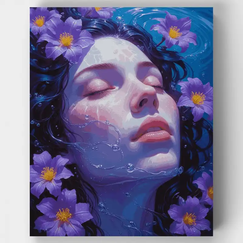 Sumérgete en la tranquilidad con este cautivador kit de pintar por números que presenta una escena submarina de ensueño. La obra de arte retrata un momento sereno rodeado de vibrantes flores moradas flotando en aguas azules, creando una atmósfera etérea con delicadas burbujas bailando alrededor de un cabello oscuro y fluido. La rica paleta de colores de morados, azules y suaves rosas evoca una sensación de entrega pacífica al abrazo de la naturaleza.¿A quién le encantará?Este fascinante kit de pintar por números es perfecto para entusiastas del arte que aprecian temas místicos e imágenes florales. Ideal para adultos que buscan una salida creativa meditativa o cualquiera que desee crear una impresionante pieza con profundidad emocional. Transforma tu espacio con este encantador retrato submarino – ¡haz tu pedido hoy y deja fluir tu creatividad!