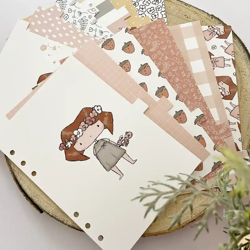 Este set incluye 12 separadores con tabulador en la parte lateral. Están impresos en cartulina laminada en mate a doble cara y taladrados con 6 agujeros estándar, para que solo tengas que meterlos en tu organizador preferido.