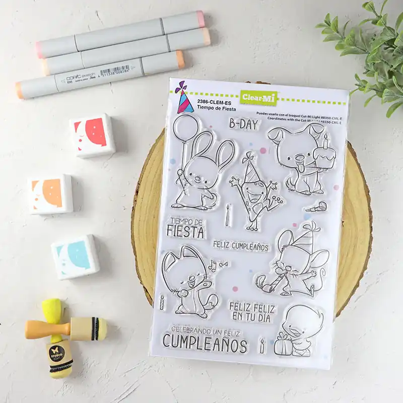 Set de sellos Tiempo de fiesta de ClearMi con preciosas ilustraciones con las que crear encantadoras tarjetas y decorar los proyectos de scrapbooking más entrañables.