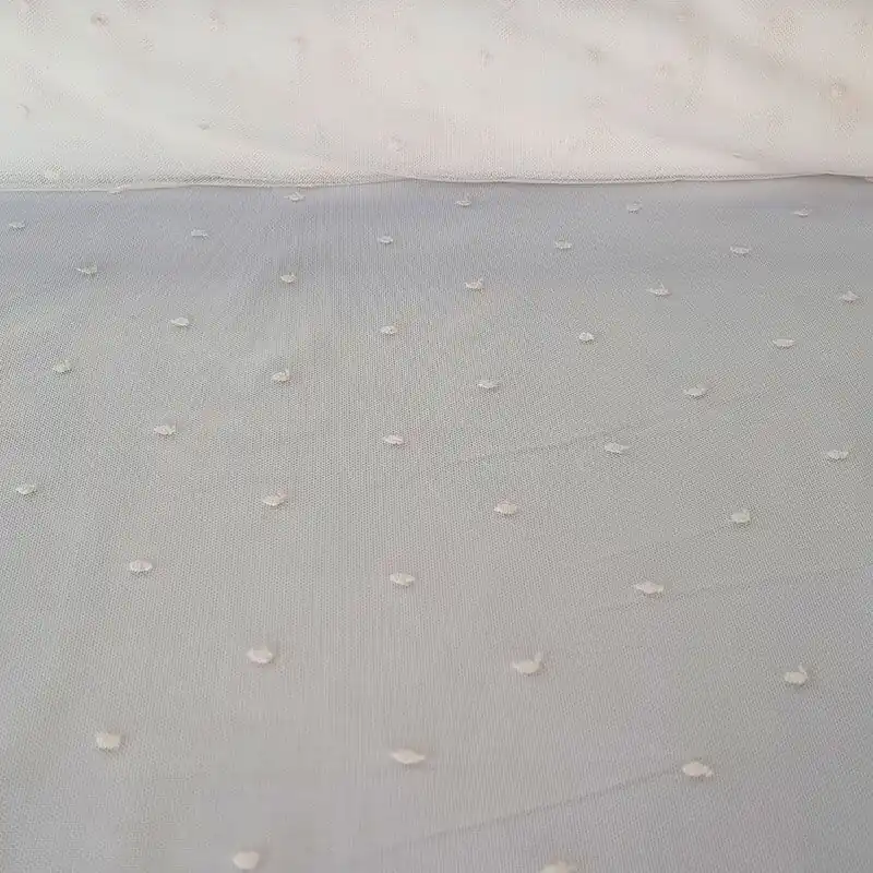 La tela de tul crudo con plumeti bordado representa una elección extraordinaria para ocasiones especiales, como comuniones y ceremonias de arras. Este tejido, elaborado en su totalidad con poliéster al 100%, fusiona la delicadeza clásica del tul con un toque de elegancia distintiva, gracias al encantador bordado de plumeti que adorna su superficie.