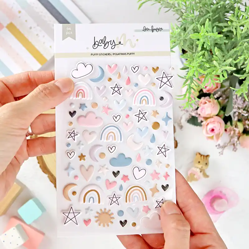 El set consta de 94 pegatinas puffy con dulces detalles como estrellas, corazones, arco iris, soles, lunas… para acompañar a los papeles de la colección.
