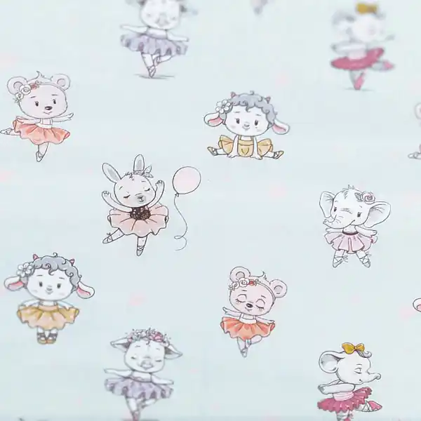 La tela Animales Bailarinas sobre fondo azul cuenta con un bonito y dulce estampado de temática infantil.