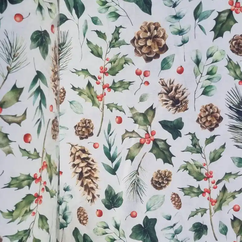 Elegir la Tela Half Panamá Cruda Acebos por metros te permite la flexibilidad de obtener la cantidad justa para tus proyectos, sin desperdiciar material. Su ancho de 2,80 metros facilita cubrir grandes superficies con un solo corte, ideal para decoraciones de mesa y manteles festivos. Este diseño de acebos y piñas refleja la esencia de la temporada, permitiéndote transformar tu hogar en un lugar lleno de encanto navideño.