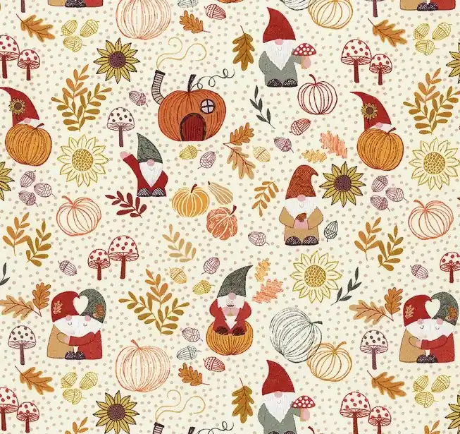 Tela Gnomos está diseñada por de Lewis & Irene. Es una original tela otoñal que pertenece a la colección Snuggle Season. Cuenta con un bonito fondo color beis y un alegre estampado en el cual aparecen dibujadas hojas, calabazas, etc de la temporada de otoño y preciosos gnomos.
