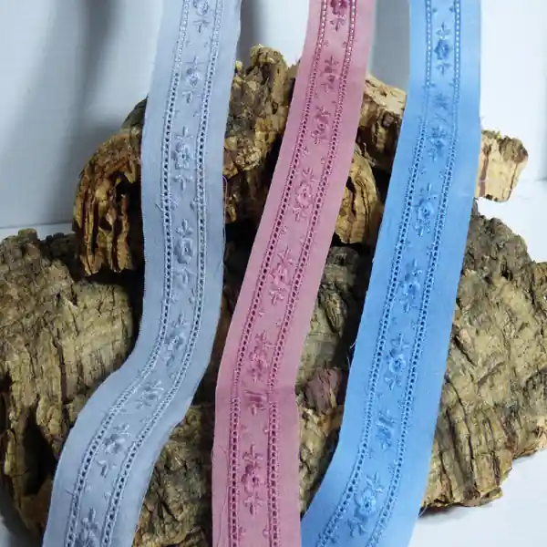 Esta tira se presenta en el tipo entredós y puedes encontrar esta bonita tira bordada en tres colores: azul, gris y rosa.