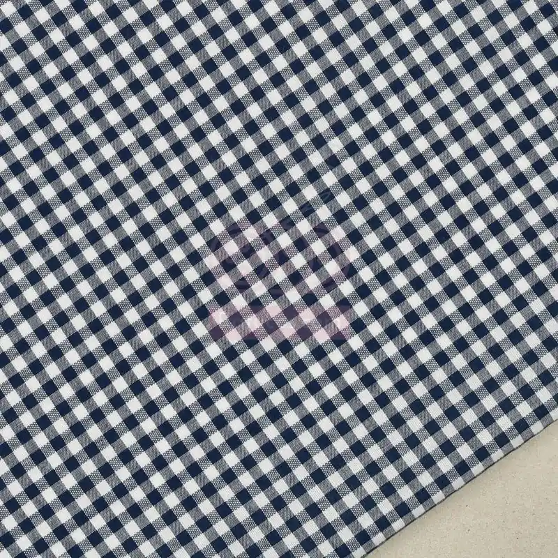Tela de tejido cuadro vichy seersucker, en color azul marino y blanco.