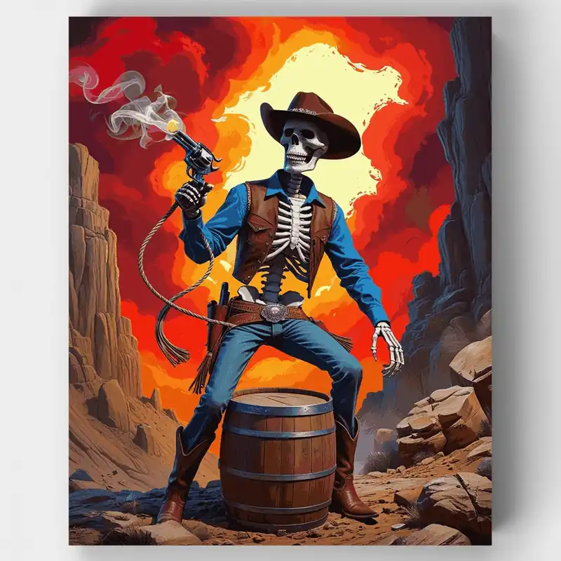 Devuelve el Salvaje Oeste de entre los muertos con este impresionante Kit Pintar por Números \\\\»Vaquero No Muerto\\\\». Esta dramática obra de arte presenta un pistolero esquelético vestido con atuendo clásico de vaquero, completo con camisa azul, chaleco de cuero y el icónico sombrero vaquero. Ambientado en un fondo naranja y rojo ardiente de paredes de cañón, el esqueleto se mantiene confiadamente sobre un barril de madera, con un revólver humeante en mano, encarnando el espíritu eterno de la frontera.¿A Quién Le Encantará?Este Kit Pintar por Números es perfecto para fanáticos de temas del oeste con un giro sobrenatural, entusiastas del arte gótico y cualquiera que aprecie imágenes únicas y llamativas. Ya seas principiante buscando desarrollar tus habilidades de pintura o un artista experimentado en busca de una pieza que inicie conversaciones, esta inquietante escena de vaquero ofrece tanto desafío como satisfacción. ¡Toma tus pinceles y da vida a este desesperado no muerto hoy mismo!