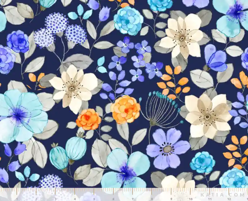 Algodón de fondo azul marino y estampado de flores en diversos colores